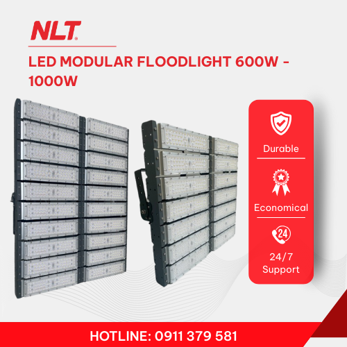 The LED modular floodlight 600W/800W/900W/1000W is an optimal choice for powerful and energy-efficient lighting needs, provided by NLT Group. The product applies advanced LED technology, delivering superior lighting performance, durability, and energy savings. With a modern design, easy installation, and strong illumination capability, the LED modular floodlight is the perfect solution for large-scale projects such as stadiums, parking lots, seaports, industrial zones, and other wide-open spaces. The light not only helps reduce operating and maintenance costs but is also environmentally friendly thanks to its optimal energy-saving capability.